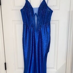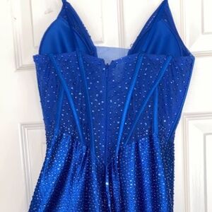Satin formal gown with a sheer corset bodice, strapless sweetheart neckline, and a low zipped- up back. “ Heat-set stones encrust this fitted prom dress, finished with a basque waist, a cutaway side slit, and a sweep train.” Only worn once. US Size 2: Bust: 32’, Waist: 25’, Hip: 35’.