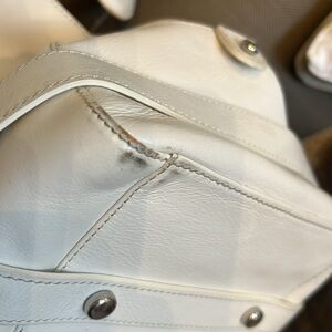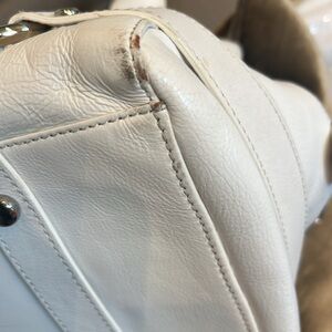 Good condition. Some wear on lower corners and minor leather scratches. Otherwise, still a beautiful white summer bag.
