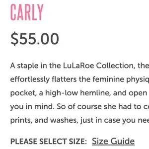 LulaRoe Carly Dress - Small. Fits Sizes: 6-8. NWT. Smoke Free Home. This is a Swing type dress with High Low hem line. It has a front patch pocket on the left side. Color: Blue, Black, Tan, Brown..