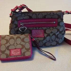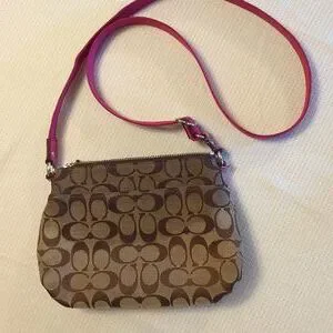 Coach pink/brown crossbody purse with main zip compartment, front zip compartment & back pocket. The strap is adjustable. I am bundling with the matching wristlet/wallet with 6 slots for cards, zip change compartment with 2 stash areas and large paper money compartment. All zips work, no tears, rips or stains. Excellent, gently used condition.