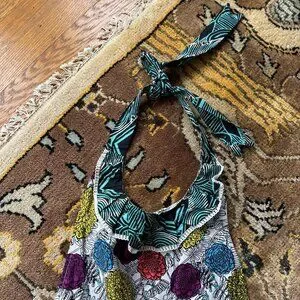 Apron from anthro. Tie at top and at waist. One pocket on front. Cute ruffley floral pattern. One small stain on front (pictured - pointing at it) that I almost didn't even catch, it blends in since the pattern is so vibrant.