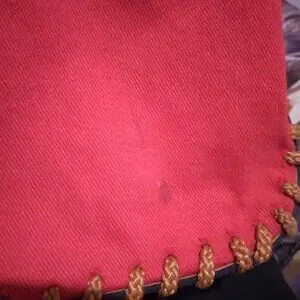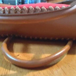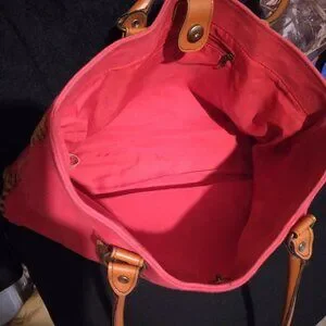 This purse is super clean inside. I don't think it was ever used. Red is a crush soft leather. I tried to picture the small stain (I think from storage) on the bottom front, really not noticeable. Leather bottom with stitching in good condition. Disney, mickey tag on inside. On the back of Disney tag, in black marker is $29.99 or $39.99.