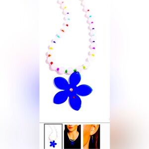 Infused along an invisible string around the neckline, a collection of milky white beads alternates with yellow, Kohlrabi, Royal Blue, purple, orange, white, coral, and light blue seed beads. Featuring an iridescent rhinestone center and an orange rhinestone accent, a Royal Blue acrylic flower dangles from the center of the display for a nostalgic finish. Features an adjustable clasp closure. Due to its prismatic palette, color may vary.