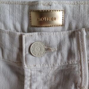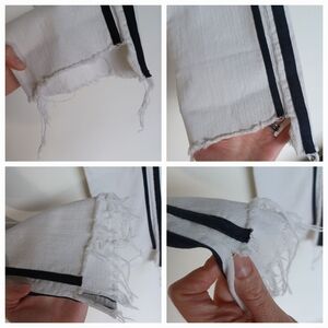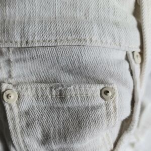 Flaws: A thread at the top of the fly is one big stitch instead of several smaller ones. It's still securely attached and does not affect the integrity of seam or nearby zipper. Right outer ankle seam has loose last stitch at intentionally frayed hem. There's some chipping to paint on tips of grommets. Flaws are minimal, as shown in close-up photos.