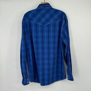 This Wrangler shirt offers a classic western look with its blue plaid design and snap button closures. Durable and stylish, it is perfect for casual wear.