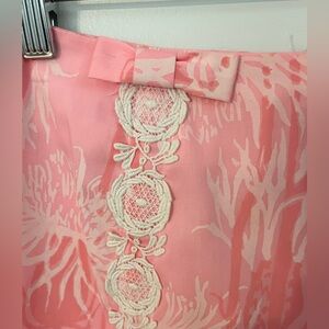 Very rare vintage Lilly Pulitzer skirt in pretty pink. Zips in back, small bow details at waist, pocket in back. Lightweight and a-line. Perfect for summer. Great vintage condition. Size 10.
