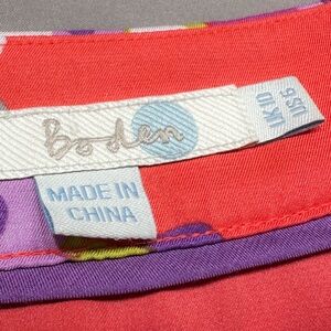 Absolutely adorable and colorful silk blend dress by Boden, women’s US size 6. Coral orange background beautiful floral flower print in purple, chartreuse green, gray. Beaded accent at neckline, side zipper, fully lined. Bust measures about 18.5 inches across, length about 35 inches. Preloved good condition. This dress is so soft and colorful!