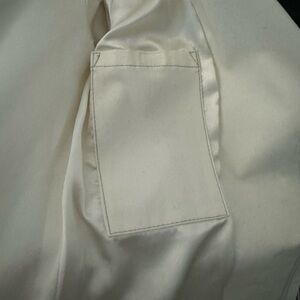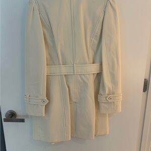EUC White House Black Market Ivory Trench size Small. Outer layer is an ivory cotton and internal fabric is lined with a silky feeling synthetic material. The coloring may be hard to tell in photos but is a true ivory with gray stitching. Has outer pockets and an internal pocket as pictured. Worn only once or twice. I have moved to a warmer climate and have been editing my closet. It’s such a nice a coat but I just haven’t worn it. I’ve always kept this coat in a whbm dress bag which I will ship it in.