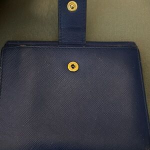 Salvatore Ferragamo blue double snap wallet. it has the Ferragamo emblem right in the front. On the side and around the wallet we have some rubbing and color transfer other than that has a little color transfer, but all snaps are snappy. You have billfold that are clean. Coin pouch is clean and you have a lot of cord slots. It’s a beautiful wallet it’s still in good condition has a lot of wear left in it if you would like to make an offer, please feel free to do so I am very negotiable