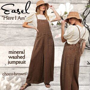 EASEL "Here I Am" Mineral Washed Wide Leg Jumpsuit Adjustable Tie Straps Pockets