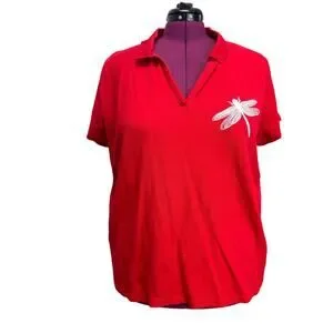 Hand Printed Upcycled Womens 3X Dragonfly Cotton Blend Collared Polo Shirt