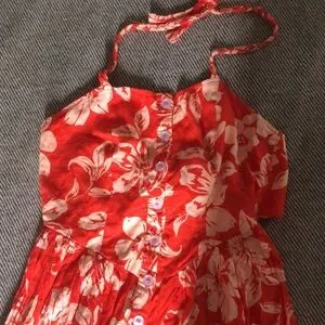 It really is a perfect sundress. Straps can be tied as a halter or buttoned at the waistband. I believe this is a sample, as there is no lining, which others seem to have. This is an xs, but runs large imo. It fits me as a medium… the bust is adjustable as it tied in back and the back of the waistband is elastic. Really great detail is the small snaps between the buttons so they don’t gap! Love.