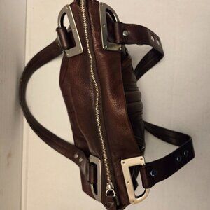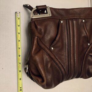 B. MAKOWSKY BROWN PEBBLE LEATHER PURSE. DOUBLE HANDLE. SATIN LINING. BEAUTIFUL CONDITION. NO RIPS, TEARS, OR STAINS.