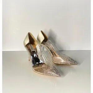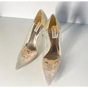 Elegant and sophisticated, these Badgley Mischka stiletto heels feature a clear PVC upper with rhinestone embellishments and satin heel caps, ideal for formal events.