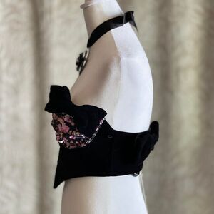 Description: brand new with tags, black velvet with bow detail, corset top bustier with floral print detail by for Love and Lemons in US women’s size S. There is no stretch to this material, but the back is adjustable with three rows of hooks and eyes. The only thing wrong with this is that it is missing the puffy sleeves; price has been adjusted to reflect this flaw. Self is 100% recycled polyester and contrast is 95% polyester and 5% spandex. She’s giving 90’s goth fairy coquette babe 🖤