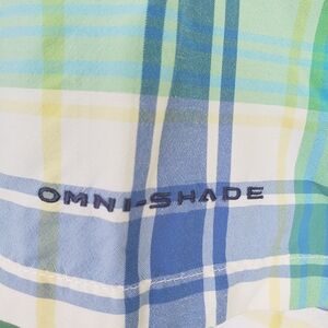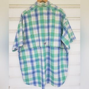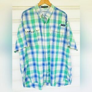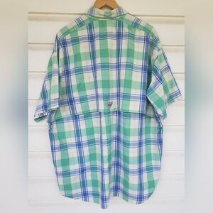EUC 2017 Colombia Super Bahama PFG Button Down Shirt. Omni-Shade. Size XXL. 63% Nylon, 47% Tactel Nylon. Extra Buttons on the interior tag. No call outs! No signs of wear! Soft and Luxuriously Lightweight. Mesh Back Air Vent. Nice and Classic Blue Green and Yellow Plaid Color Combination. Measures 28.75" armpit to armpit and 31" long (approx.). Check out more cool items in this closet!
