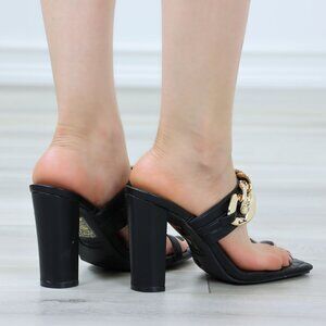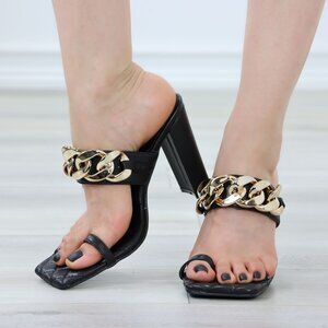 Black Toe Ring Strap Block High Heels Sandals Gold Chain Quilted Patter Insoles