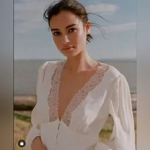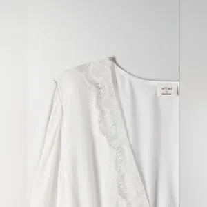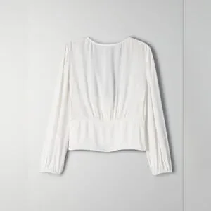 This is a feminine, lantern-sleeve blouse with a plunging, lace-trimmed V-neck, an empire waist and a corset bodice. It's made with lightweight, pebbled fabric.