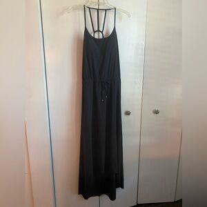 Lightweight black Athleta dress in size 4. Features built-in bra with removable pads, adjustable tie waist, and high-low hem.