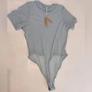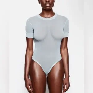 Brand new with tags SKIMS mesh T-shirt bodysuit in a classic Color: Sky. See-through crew-neck with short sleeves, this bodysuit is perfect for casual occasions. Snap closure thong adds a touch of convenience, making it easy to wear. Made with breathable and stretchable mesh.