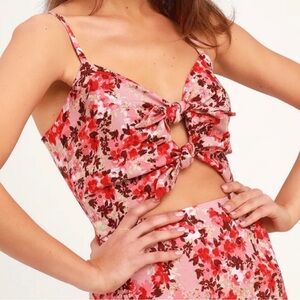 Soft woven fabric boasts a red, pink, burgundy, and green floral print as it sweeps from adjustable skinny straps into a flirty bodice with two tie-front details. A cutout detail tops the slinky, short skirt. Hidden back zipper/clasp.