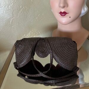 This small, but powerful brown straw hat from the 1930s' is so unique. The hat is composed of two conical shapes attached by a circular shape at the center, and by crisscrossed straps at the back, surely to attach the hat on top of the hair via hairpins. This is such a beautiful hat that surely will cause a sensation when worn today.