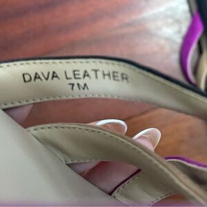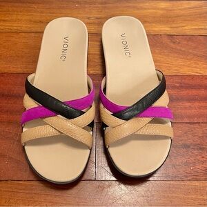 Excellent condition Dava leather flat sandals from Vionic. Strappy design with bold colors. Orthotic footbed with arch support.