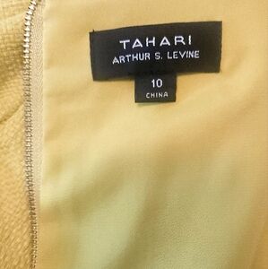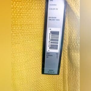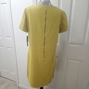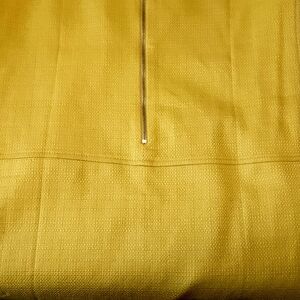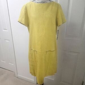 In a vibrant golden rod color, with matching lining, the dress has two front zippered pockets with gold tone hardware and an exposed zipper back closure.