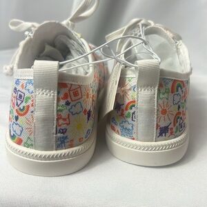 Super cute kids doodle print on a white shoe with lace and front zipper. Easy for kids who can’t tie shoes
