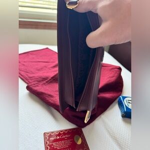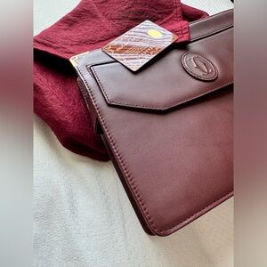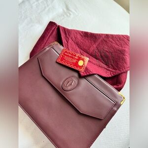 Introducing the Cartier Must de Cartier Burgundy Leather Clutch Bag, a sophisticated accessory designed for timeless elegance, crafted with luxurious leather in a rich burgundy hue, showcasing the iconic Cartier style. Perfect for adding a touch of refined glamour to any evening ensemble with its sleek design and impeccable craftsmanship,.