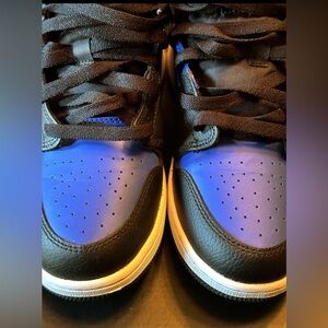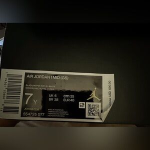 Air Jordan 1’s Mid grade school shoes. The size is a 7 & the color is hyper royal blue and black with white. These shoes are in excellent condition. I purchased these shoes from StockX.