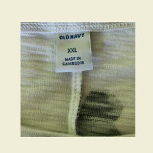 Old Navy t-shirt dress, size XXL, white base with navy pattern of tropical leaves. Measurement across bust, beginning just under sleeve, is approximately 24.25". Thin which makes it a great cover-up for a bathing suit. Hits below the knee for 5'3". Cotton blend. Machine washable. Gently used. From smoke-free home. No rips or tears. Comfortable and cool for summer!