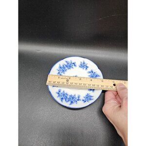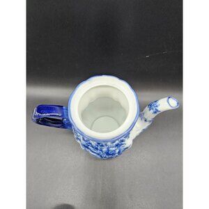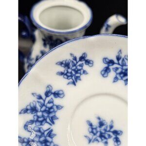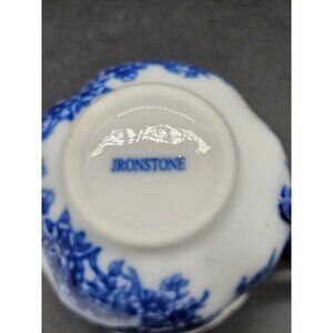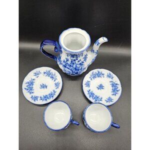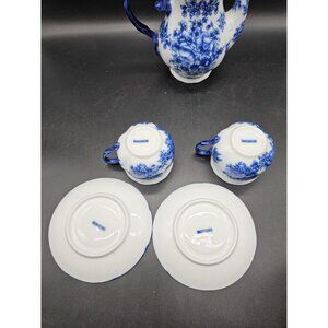 This vintage set of Ironstone tea pot, teacups, and saucers is a beautiful addition to any collection. The flow blue porcelain material with a floral pattern adds a touch of elegance to any tea time. The set includes a tea pot (missing lid) with a pair of teacups. The production style is flow blue, and the color is blue.