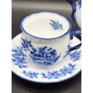 Flow Blue Ironstone Floral Teapot No Lid And Pair Of Teacups W/ Saucers Vintage