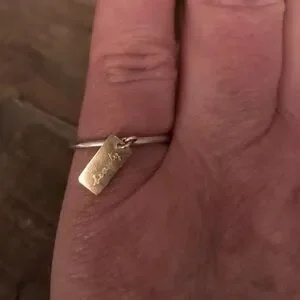 Jeanine Payer size 7 sterling ring with an 18k gold dangle inscribed with “Seek” on one side and “Beauty” on the other. The band on this unique ring is 1mm wide and the gold dangle measures 10mm x 4mm. The ring is in good pre-owned condition, with scratches that show under magnification (as depicted in the images) but are not visible to the naked eye. Includes the brown JP storage pouch as shown. From a smoke and perfume-free home. Thanks for looking 😊!