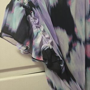 In like new condition. Multicolored top with a roluffled neck that has a tie that is adjustable. Ruffled layed short sleeve. Has a sheer black lining.