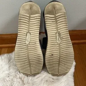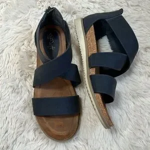 euroSoft Landry II, Navy Blue, Size 8.5. Cork base with a zipper back for an easy on and off. No scuffs and show minimal wear. Dress them up for work or casual enough for a fun time out on the town. Super comfortable! Smoke free home.