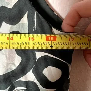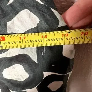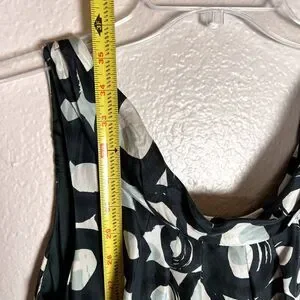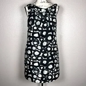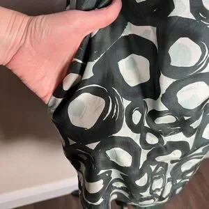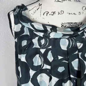 This mini dress from New York & Company is 100% silk with a hunter green and white circle pattern. The lining of the dress has been tacked up a bit to make sure it does not show below the silk dress.