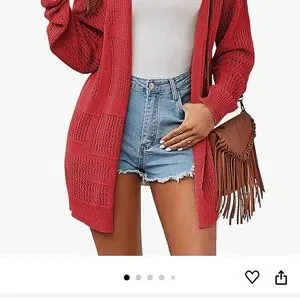 New red cardigan. No tags, purchased from Amazon but missed the return time. Looks more pink.