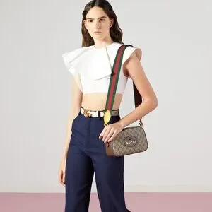 A collection of vintage inspired bags speaks to the contemporary voyager, trimmed with the House Web stripe. Made in GG Supreme canvas, this camera bag has yellow leather details.