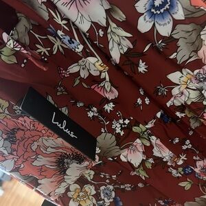 Brand new with tags dress from lulus. This is a gorgeous burgundy floral long dress! The bottom has 3 tiers. Top is halter with flutter sleeves! It has an open back with tie and back zipper!
