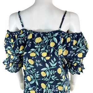 Love Riche Cold Shoulder Ruffle Floral Blouse sweetheart neckline. Spaghetti shoulder straps. Off-the-shoulder ruffle sleeves. Yellow floral print throughout.