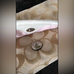 -Coach signature C tan canvas leather trimmed fold over wristlet wallet