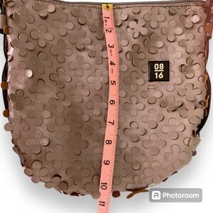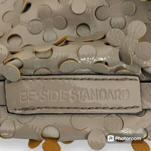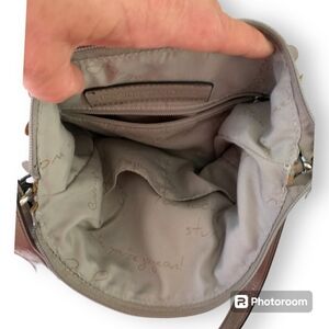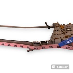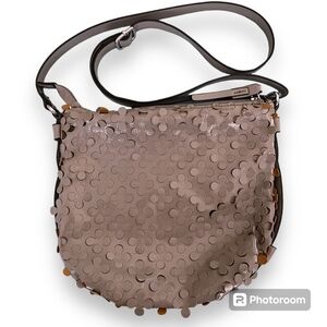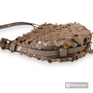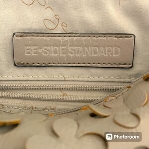 EXCELLENT, LIKE NEW Leather crossbody with floral pattern cutouts that aren't complete cot out for fun detail.. taupe in color. made by a high end German Brand, Be-Side Standard.