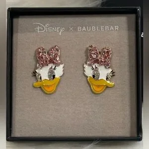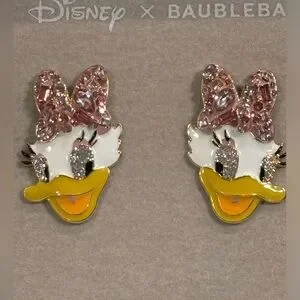 These BaubleBar studs feature the beloved Disney character Daisy Duck and are a must-have for any Disney fan. The earrings are beautifully stoned and a unique addition to any jewelry collection. The earrings are brand new and have never been worn, making them a perfect gift for yourself or someone special. These earrings are a part of the Disney BaubleBar collection. Add a touch of Disney magic to your wardrobe with these stunning Daisy Duck earrings.