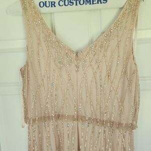 Used once in good shape! There is 2 small tears on the back from shoe wear. Blush color, floor length. 100% Polyester.