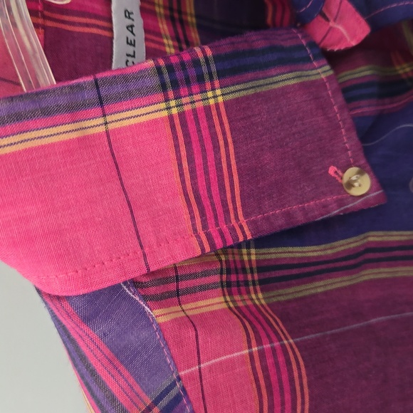 good used condition. Clear Creek. plaid. 65% Polyester. 35% Cotton. red, blue, and yellow. chest 22 inches. length 28 inches. B6