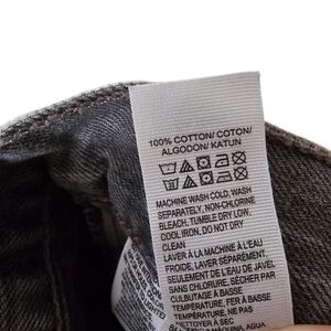 Gray denim with factory distressing, zipper and button closure, 2 front and 2 back pockets.