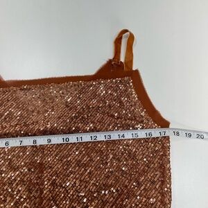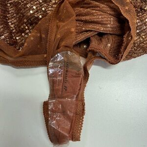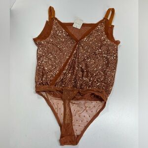 “An easy way to add some glimmer and glamour to any look, this Free People bodysuit is completely covered with bright, copper-tone sequins.”