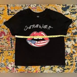 The top is machine washable and lightweight, making it perfect for all seasons. The cropped style makes it a great choice for any woman looking for a comfortable and trendy top. The design features positivity and America themes, adding a touch of patriotism to your outfit. See pictures for reference, condition and measurements.